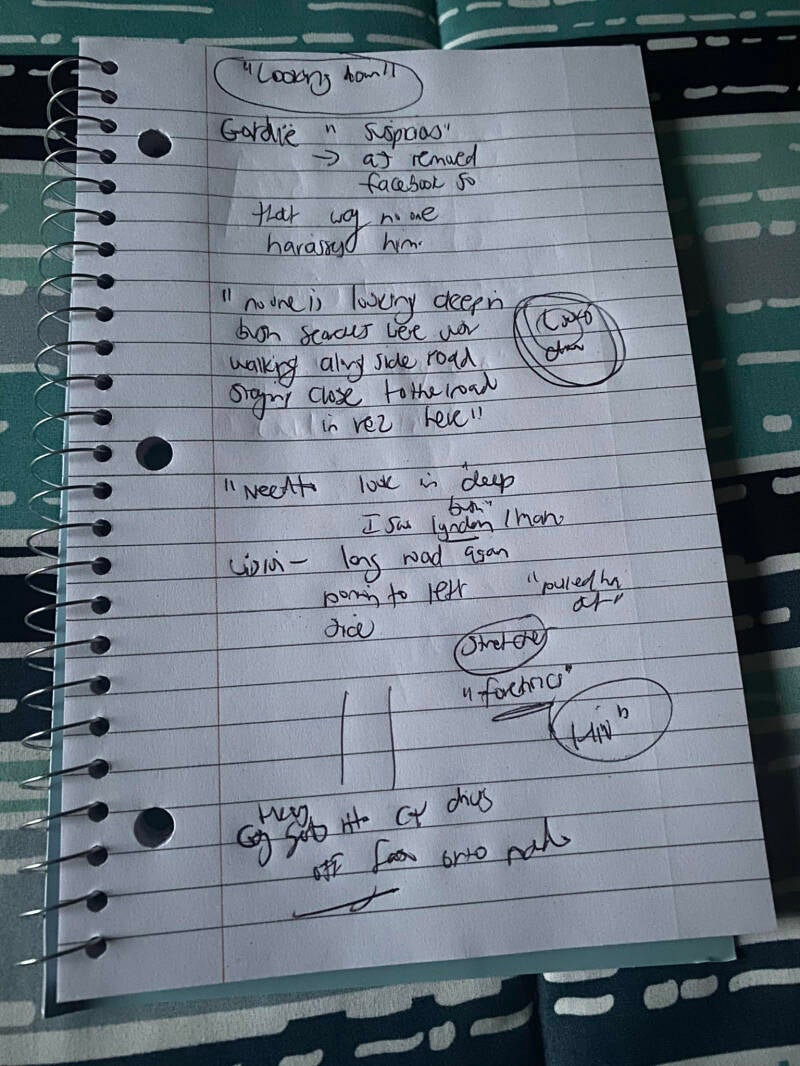 You can see Stephanie's sketches are identical and on her second note she describes the case and other things she saw with the case such as: "Stretcher" "Forenics" "Search team only looking by side of the road" "Need to look in deep bush"